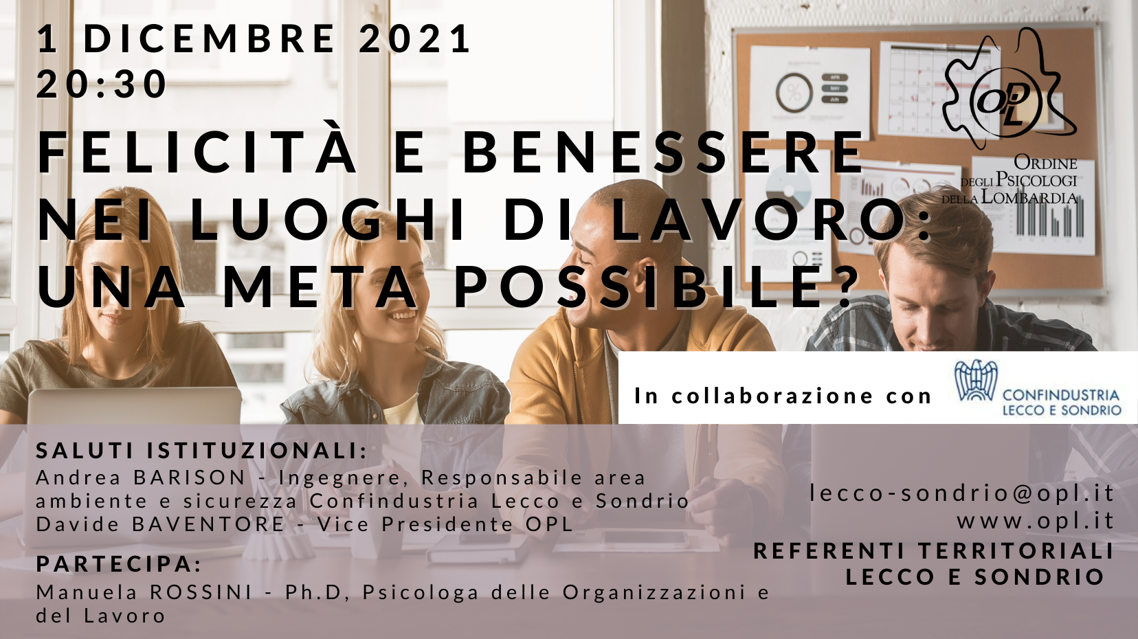 Evento aperto agli iscritti dell'OPL interessati alla psicologia del lavoro e delle organizzazioni e datori di lavoro, dirigenti e RSPP iscritti a Confindustria Lecco e Sondrio.