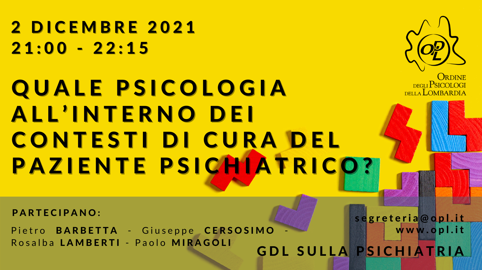 Nella sezione “EVENTI” del sito, OPL offre ai propri iscritti e ai cittadini un servizio di informazione su eventi, corsi e iniziative d’interesse nella divulgazione e formazione della psicologia, non necessariamente promosse e/o patrocinate da OPL , bensì su iniziativa di soggetti terzi.