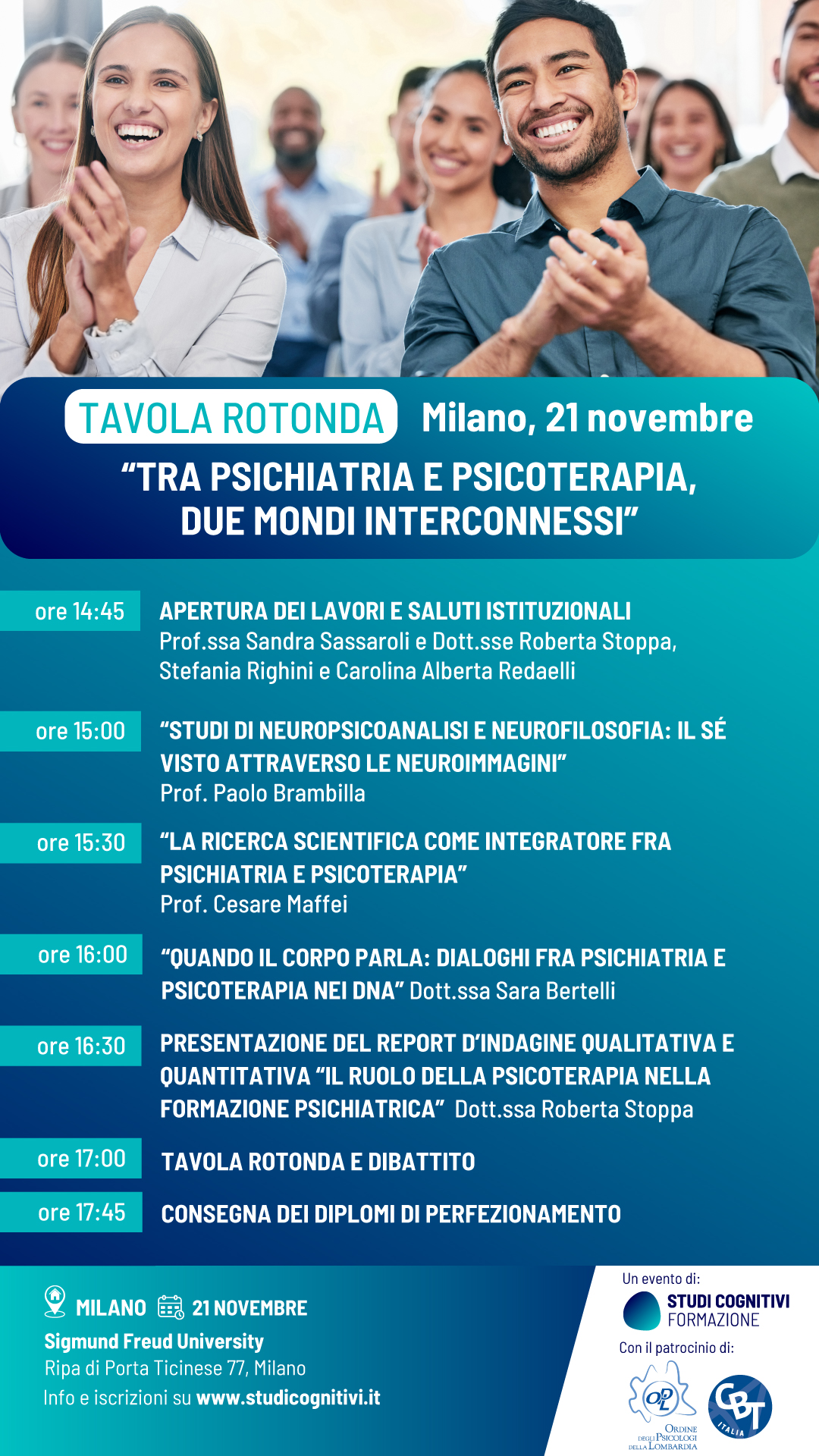 LINK ALLA PAGINA WEB DELL’EVENTO PER ISCRIZIONI: https://www.studicognitivi.it/evento/milano- tavola-rotonda-tra-psichiatria-e-psicoterapia-due-mondi-interconnessi/