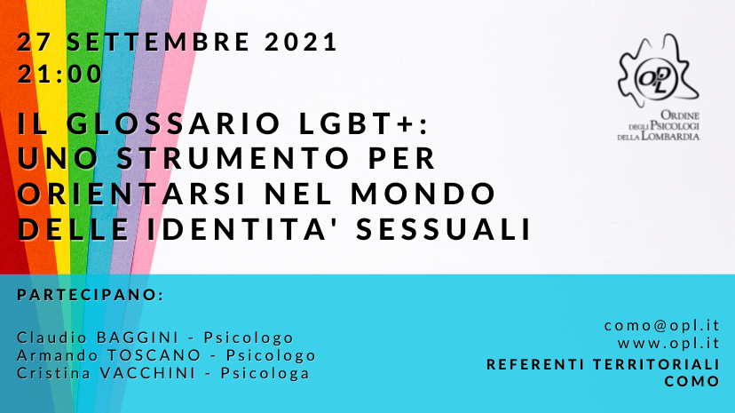 Il seminario è organizzato dall’Ordine degli Psicologi della Lombardia con l’aiuto delle Referenti Territoriali per l’Ordine dottoressa Rossella Dartizio e dottoressa Antonella Remotti e vede come relatori due consulenti di OPL nel Gruppo di Lavoro LGBT+.